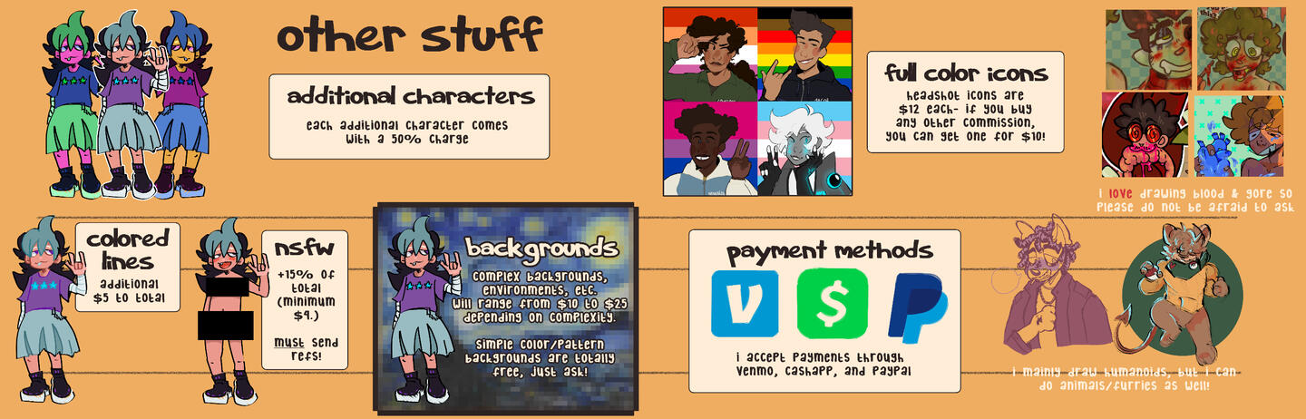 As of right now, my commissions are open! You can request one by filling out the Google Form below. The drive links to a continuously updated collection of my work.